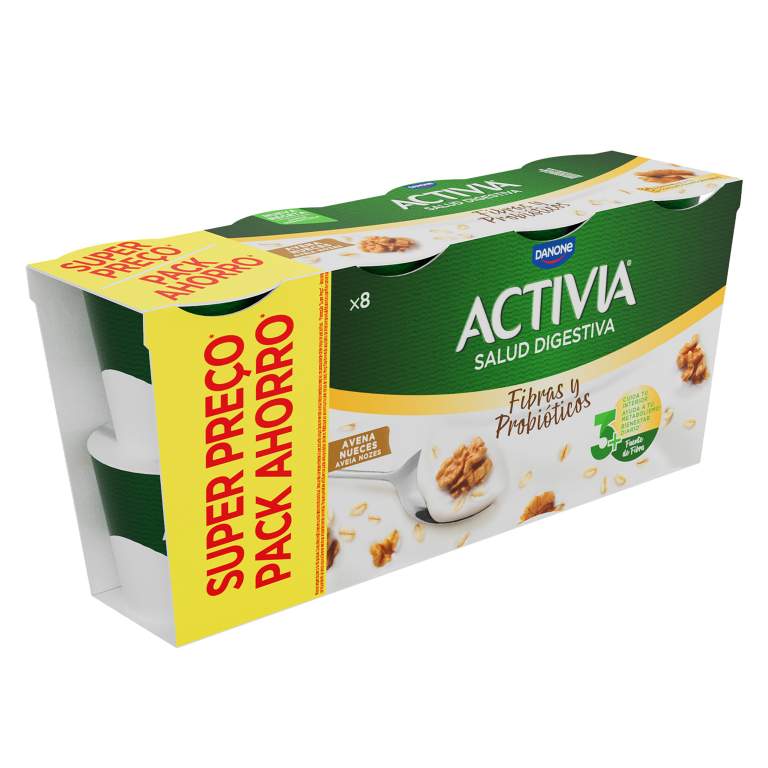 Disfruta del pack familiar de Activia Fibras Avena Nueces, 8 unidades de este yogur cremoso rico en fibra y con el crujiente de la avena y las nueces.